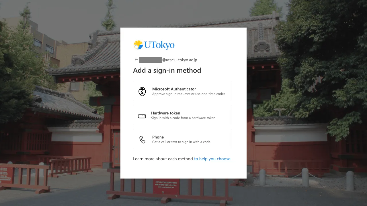You can use a dedicated device called FIDO security key to authenticate. There are some systems where you cannot use it, so you have to register another method as primary and use them as alternative. For more details, see How to use FIDO security key for Multi-Factor Authentication for UTokyo Account (in Japanese).