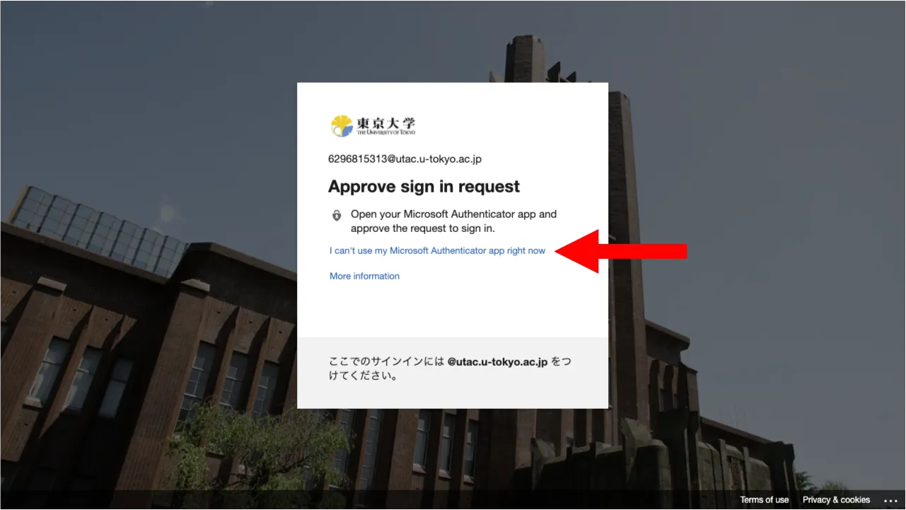 If you want to use a verification method not displayed One of the added verification methods (usually the first method added) will automatically become your “default sign-in method”. When you sign in, the system will ask you to verify your identity using the default sign-in method. If you wish to sign in with a different method, click the “Use a different verification option” or “I can’t use my Microsoft Authenticator app right now” link. The default sign-in method can also be changed by following the procedure described in the “Changing the Default Sign-in Method” page.