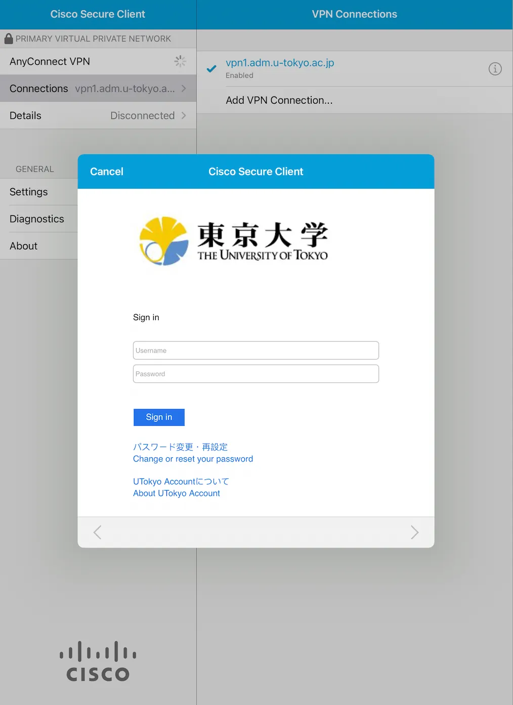 Step E: Confirm that “vpn1.adm.u-tokyo.ac.jp” is listed in the “Connections” column at the upper left of the screen as shown in the first image below. Next, turn on the toggle button next to “AnyConnect VPN” and sign in with your UTokyo Account when the UTokyo Account authentication screen appears as shown in the second image below. If you launch the VPN shortly after your previous access, the VPN connection may start immediately without displaying this screen.