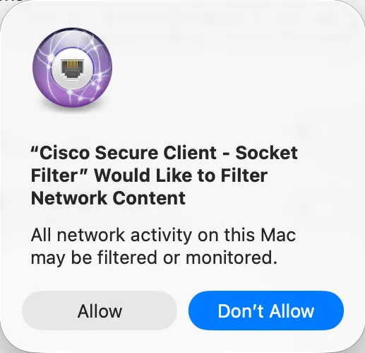 Step D: Wait a moment; a window with the following message “Action Required Cisco Secure Client - System Extension Blocked.” may appear. Please follow the instructions to allow the system software from “Cisco Secure Client - Socket Filter” to click the 🛈️ button, which is displayed in the right of “Network Extensions” in “Login Items & Extensions” in “General” in “System Settings”. When a window with the following message ‘“Cisco Secure Client - Socket Filter” Would Like to Filter Network Content’ appears, please click the “Allow” button.