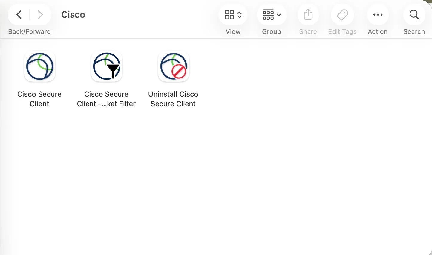Step E: If the installation was completed successfully, a folder named “Cisco” is created in the Applications folder. In the folder, the VPN client application “Cisco Secure Client.app” is installed.