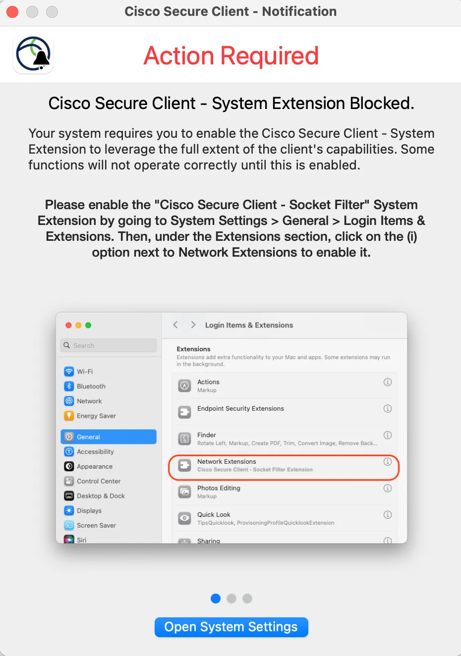 Step D: Wait a moment; a window with the following message “Action Required Cisco Secure Client - System Extension Blocked.” may appear. Please follow the instructions to allow the system software from “Cisco Secure Client - Socket Filter” to click the 🛈️ button, which is displayed in the right of “Network Extensions” in “Login Items & Extensions” in “General” in “System Settings”. When a window with the following message ‘“Cisco Secure Client - Socket Filter” Would Like to Filter Network Content’ appears, please click the “Allow” button.