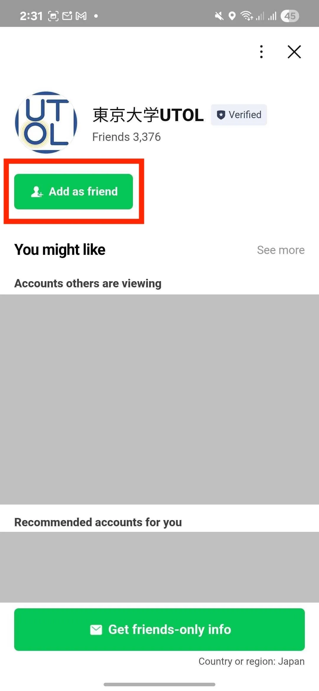 - Open the LINE App, and go to the chat room with “東京大学 UTOL”.