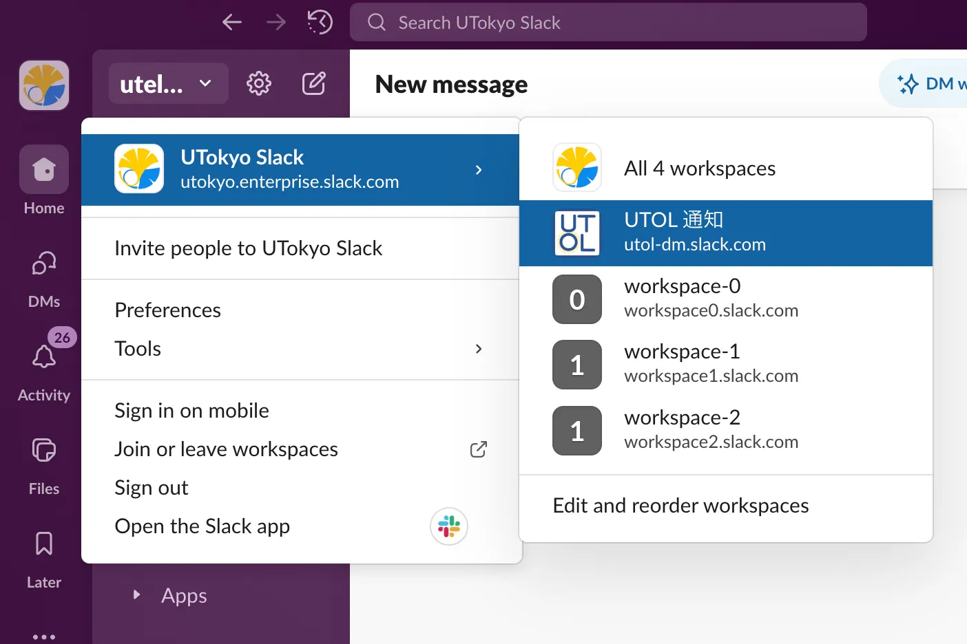 - Notification will be sent via direct message from “UTOL通知” (Slack App). You can view these direct messages by opening the “UTOL通知” in the Apps menu.