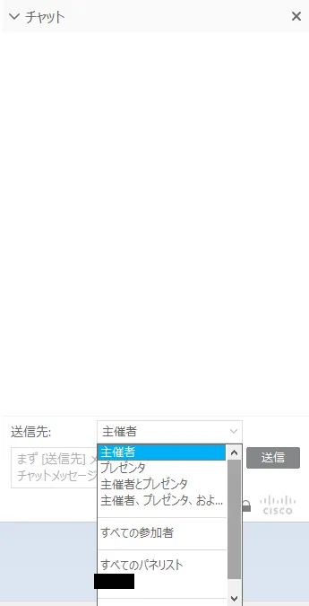 • Chat panel allows all attendees to send messages. You can send a message to organizers or presenters by switching the email destiny.