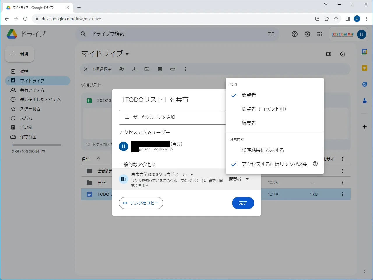 • 誰でもアクセスできるようにする設定と,東京大学のECCSクラウドメールのアカウントを持っている人に限り誰でもアクセスできるようにする(ECCSクラウドメールのアカウントを持っていない人を除外する)設定の,2つの設定が可能です.