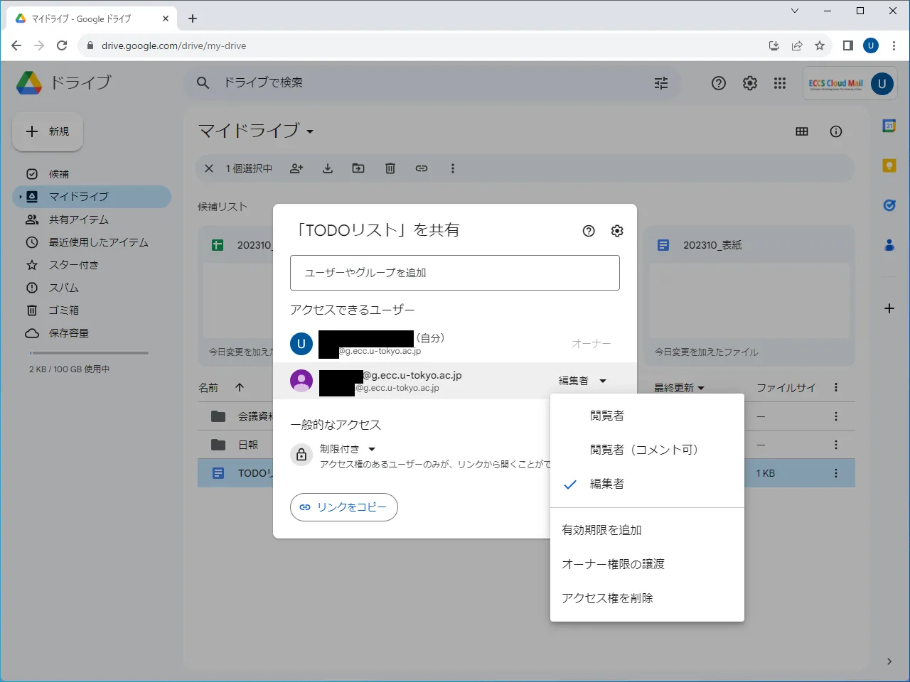 1. 共有設定画面を開いた後,「アクセスできるユーザー」欄にこれまでに共有した相手が一覧表示されます.削除・変更したい共有相手を探してください.
