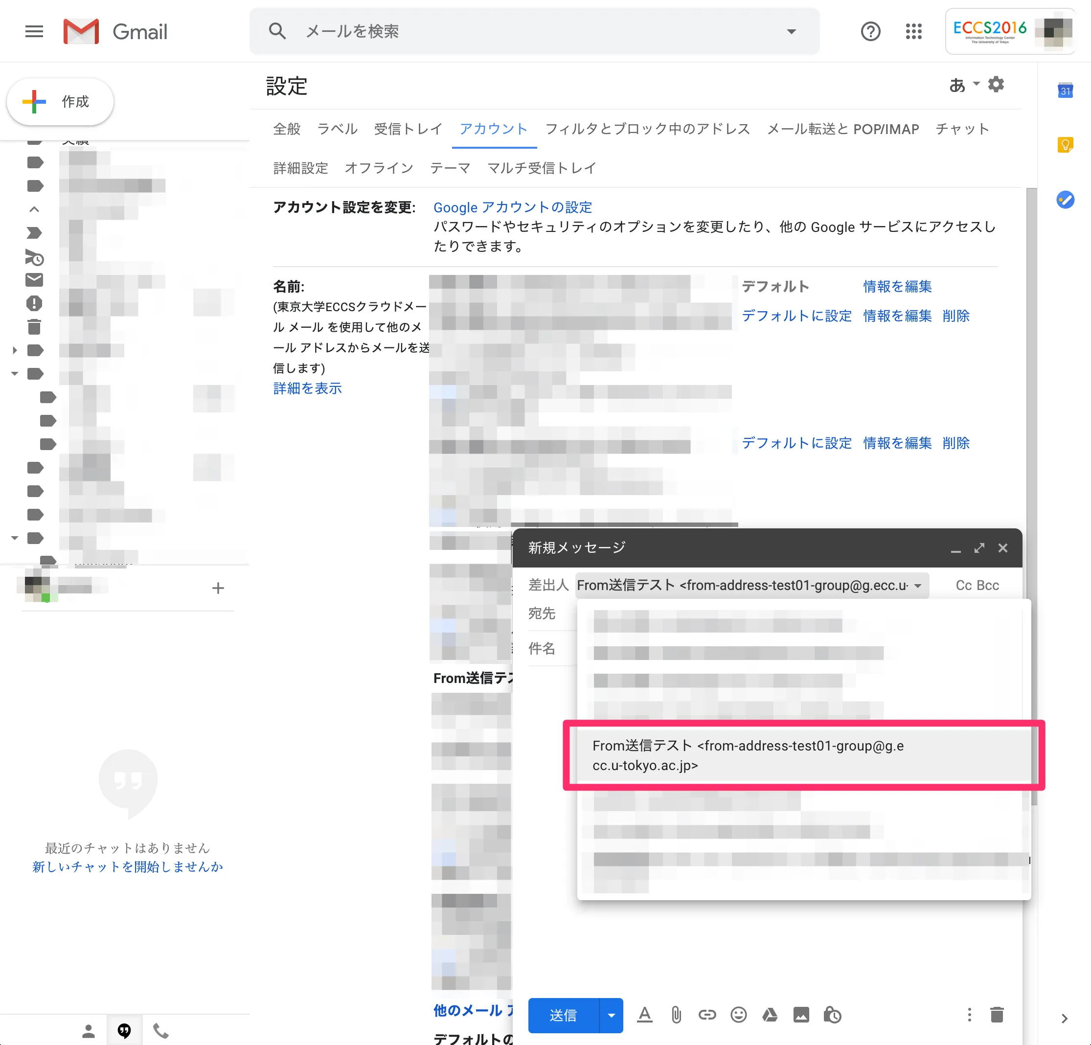 8. ECCSクラウドメールのメール作成画面で「差出人」の欄を操作し,メーリングリストのアドレスを選択できることを確認してください.