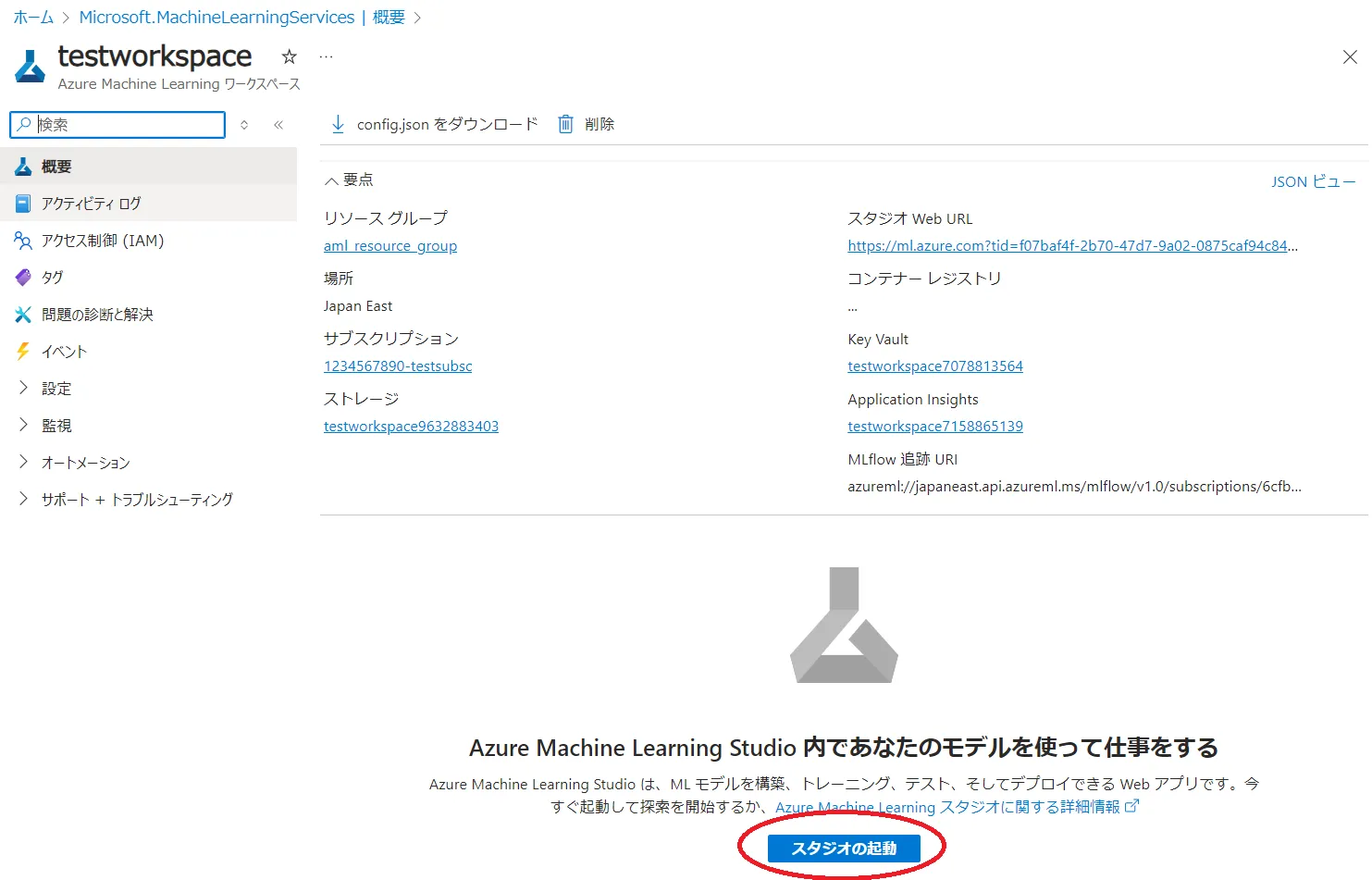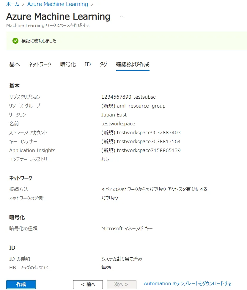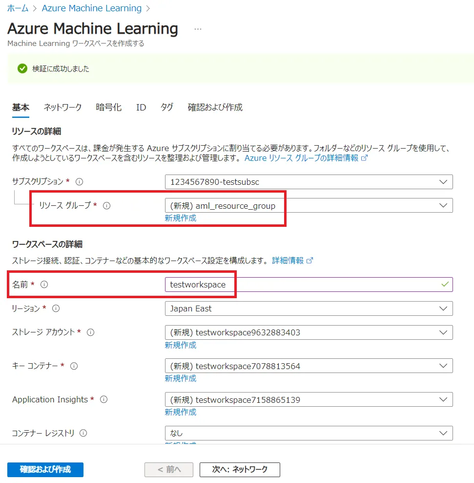 • 名前:リソースのポータルでの名称を設定します.ここではtestworkspaceとしています.