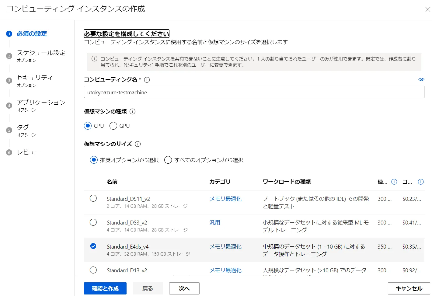 • コンピューティング名:適当な名前を命名ください.注意点として,マシンが置かれるリージョン内でユニークである必要があるので,すでにある名前とエラーになった場合は別の名前をお試しください.