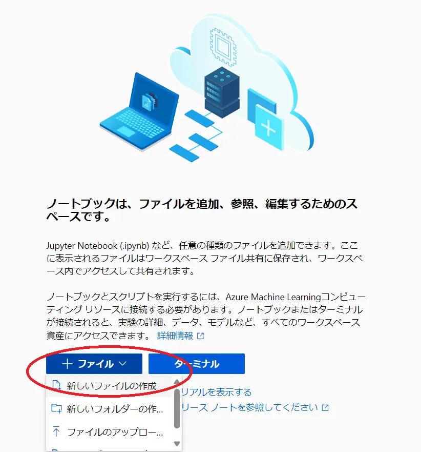 • Notebookの画面で+ファイルから新しいファイルの作成をクリックしてください.