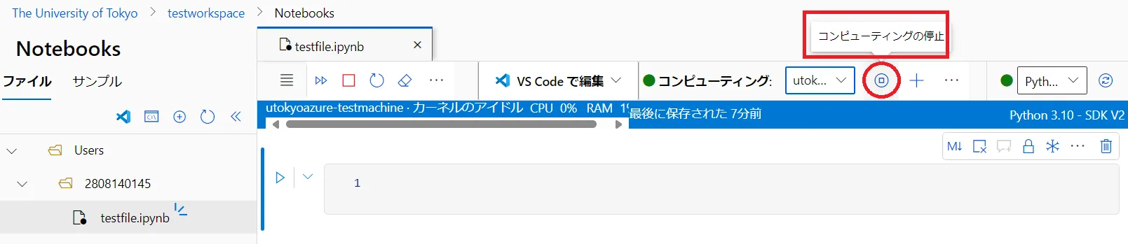 • ファイル編集画面の上部に、コンピューティングの停止ボタンがあるのでクリックする.