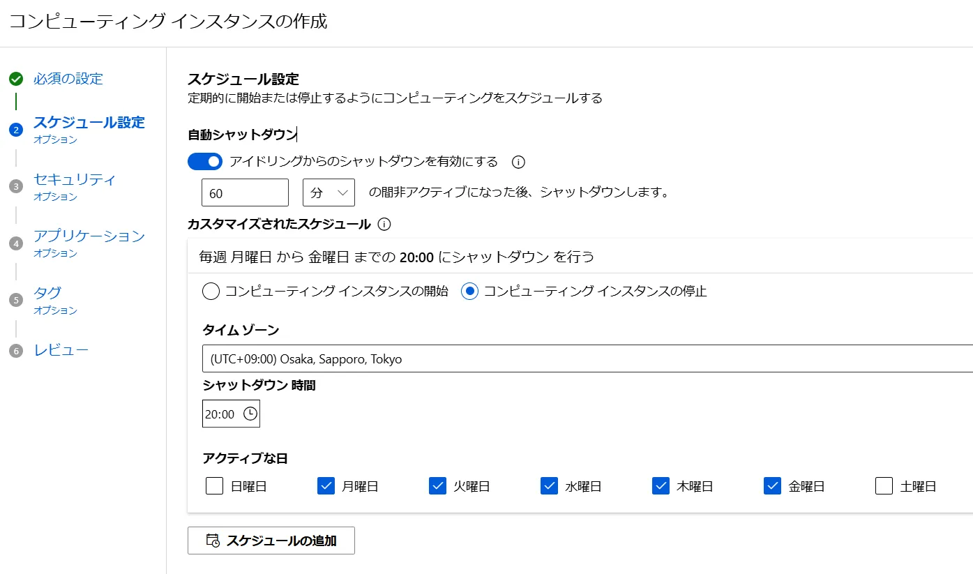 起動も自動化させる場合は,スケジュールの追加をしてコンピューティングインスタンスの開始の条件を設定してください.