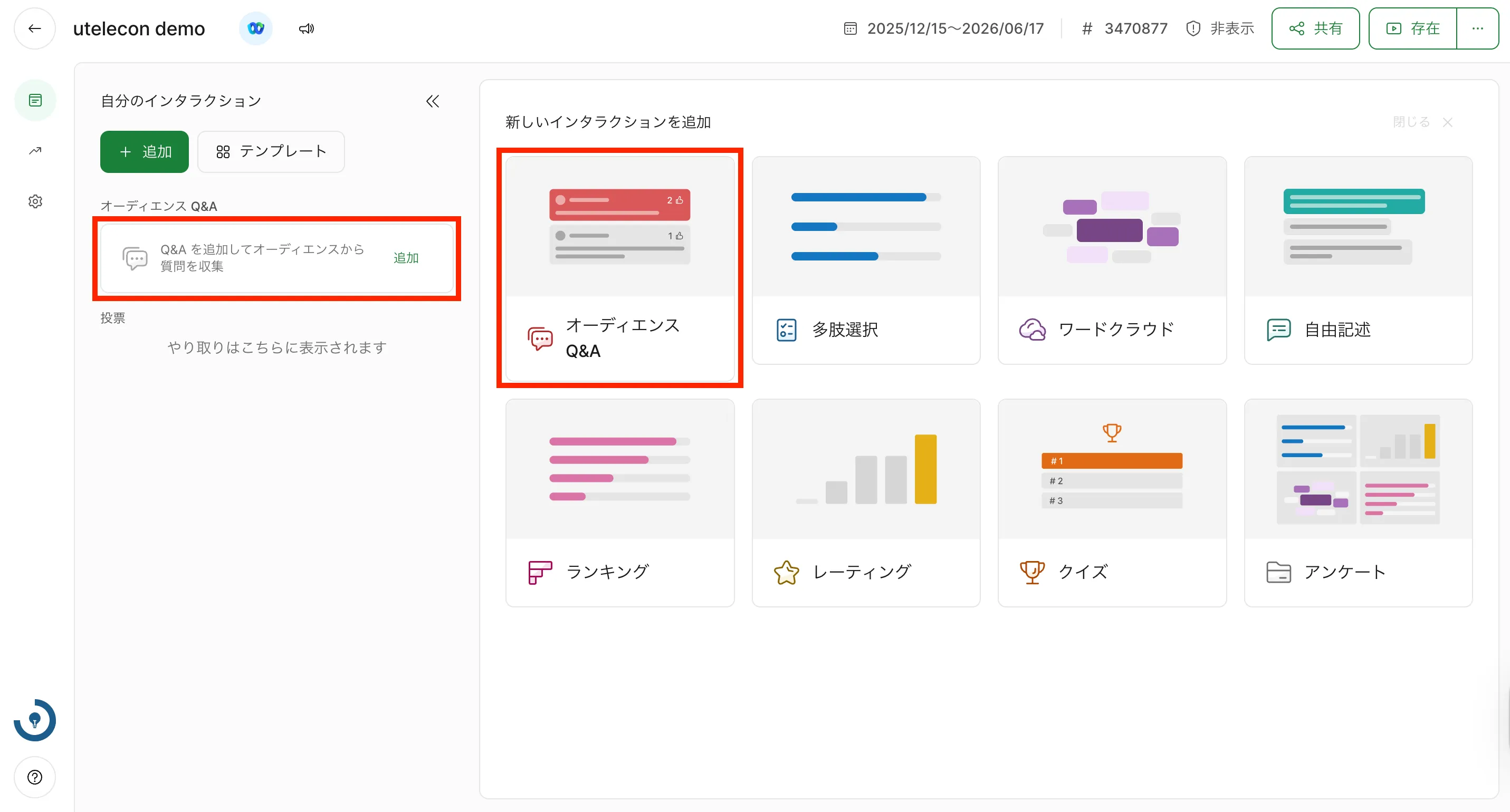 Q&Aを作成するには,画面左上または「新しいインタラクションを追加」内の「オーディエンス Q&A」を選択してください.