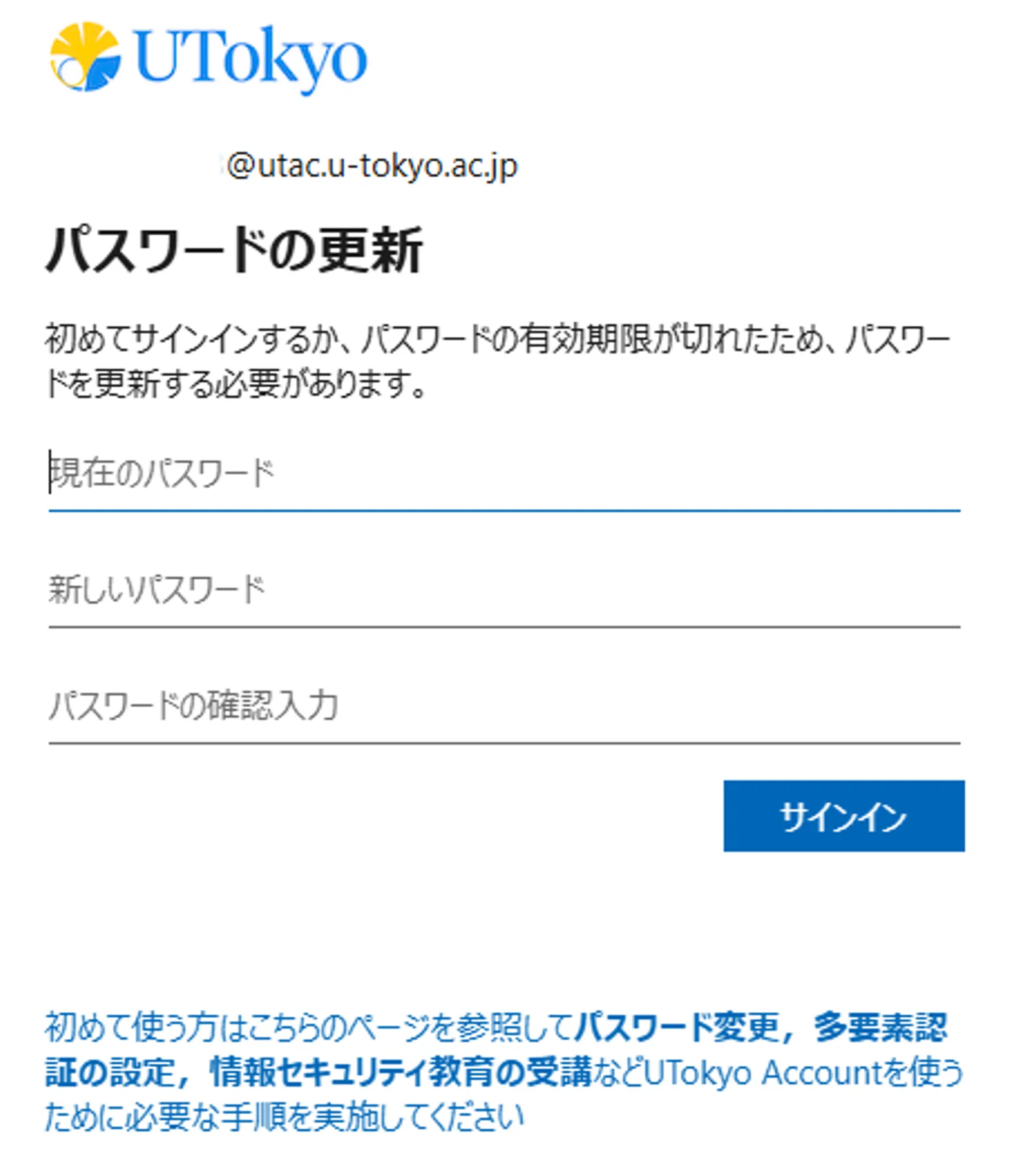 2. 以下の「UTokyo Account利用者情報確認サイト」に,「パスワード通知書」に記載されたUTokyo Accountと初期パスワードでサインインしてください.
