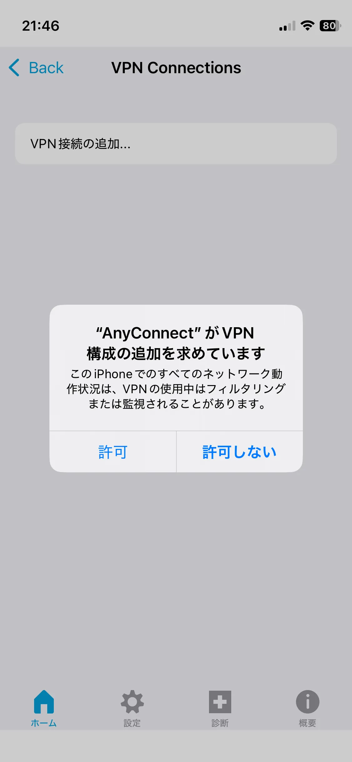 手順D: 「保存」を押すと,以下のようにVPN構成の追加を求められるので,内容の確認の上で「許可」を押します.さらに追加でTouch IDによる認証などを求められることもありますので,その際は認証を行ってください.