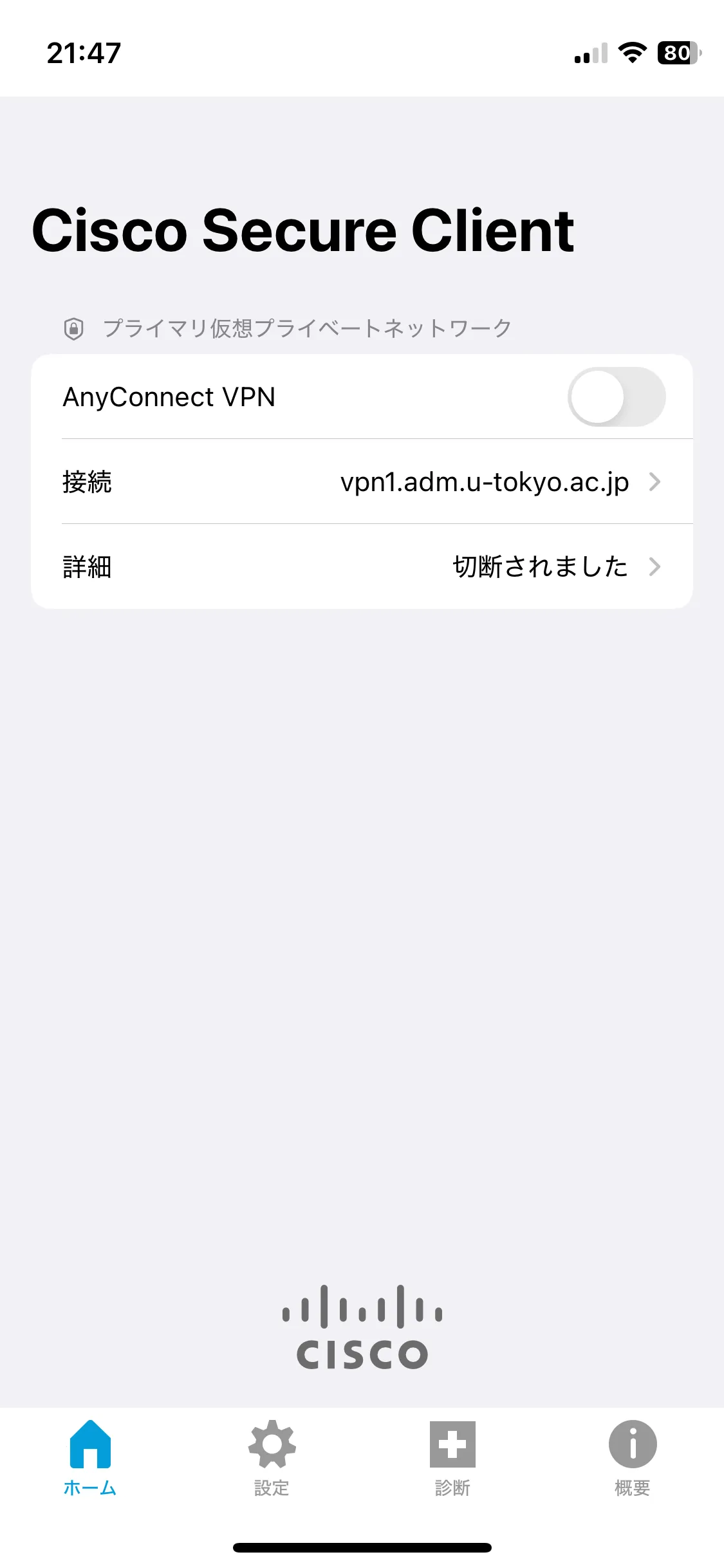 VPNを切断する際は,この画面のトグルボタンをタップして「詳細」が「切断されました」になったことを確認してください.