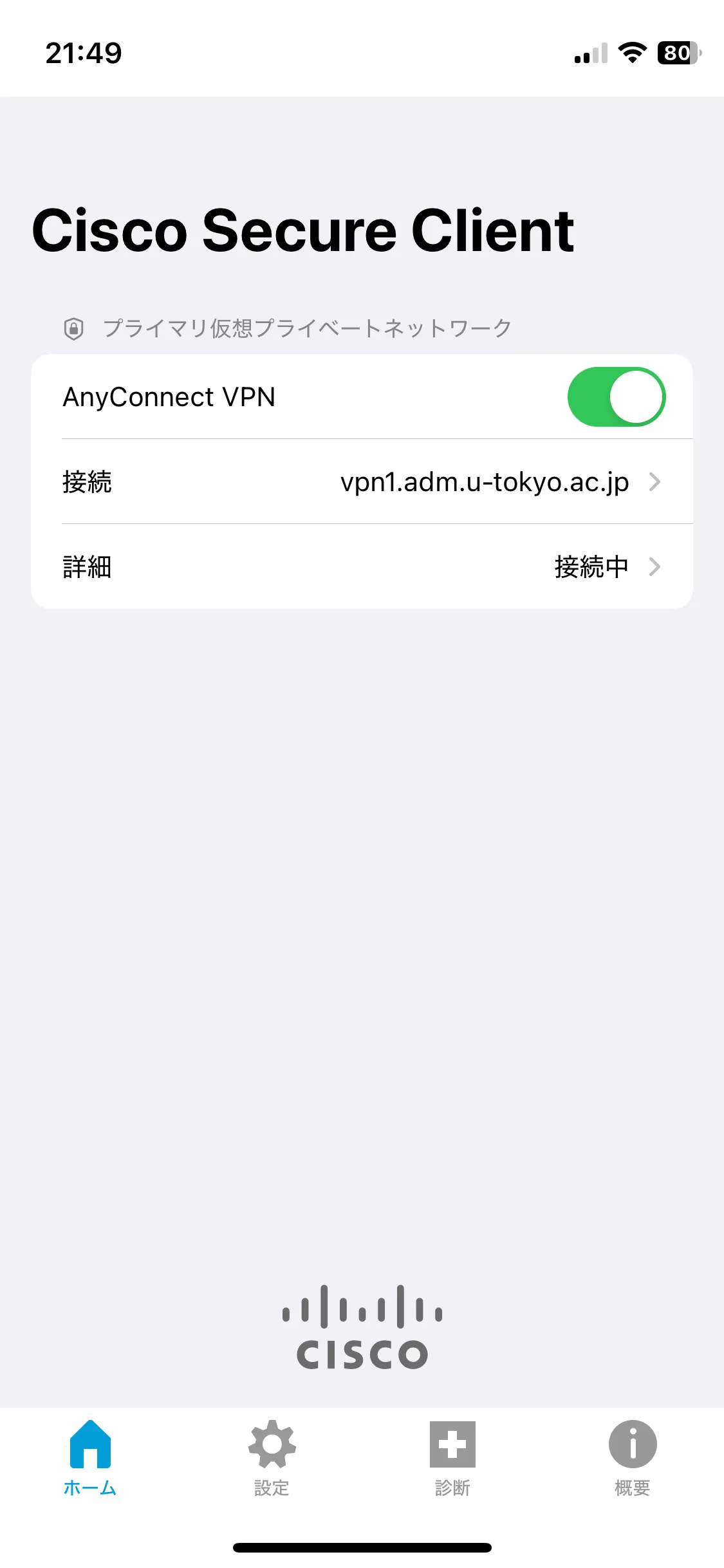 手順G: 以下の画面のように「詳細」が「接続中」と表示されていれば,お使いの機器はUTokyo VPNに接続している状態です.