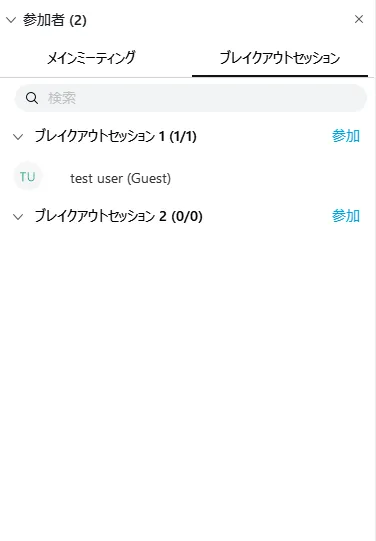 - 参加者の一覧がメインミーティングとブレイクアウトセッションに分かれます.ブレイクアウトセッションには各セッションごとに参加者が一覧表示されます.