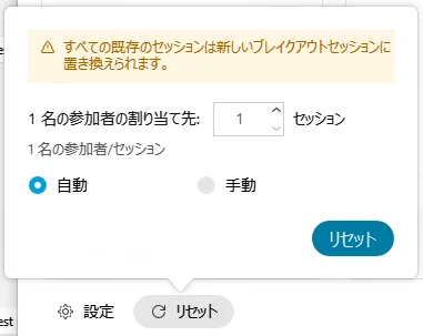 - 「リセット」をクリックすると,ブレイクアウトの個数の設定からやり直すことができます.手でやった割り当てはすべて上書きされます.