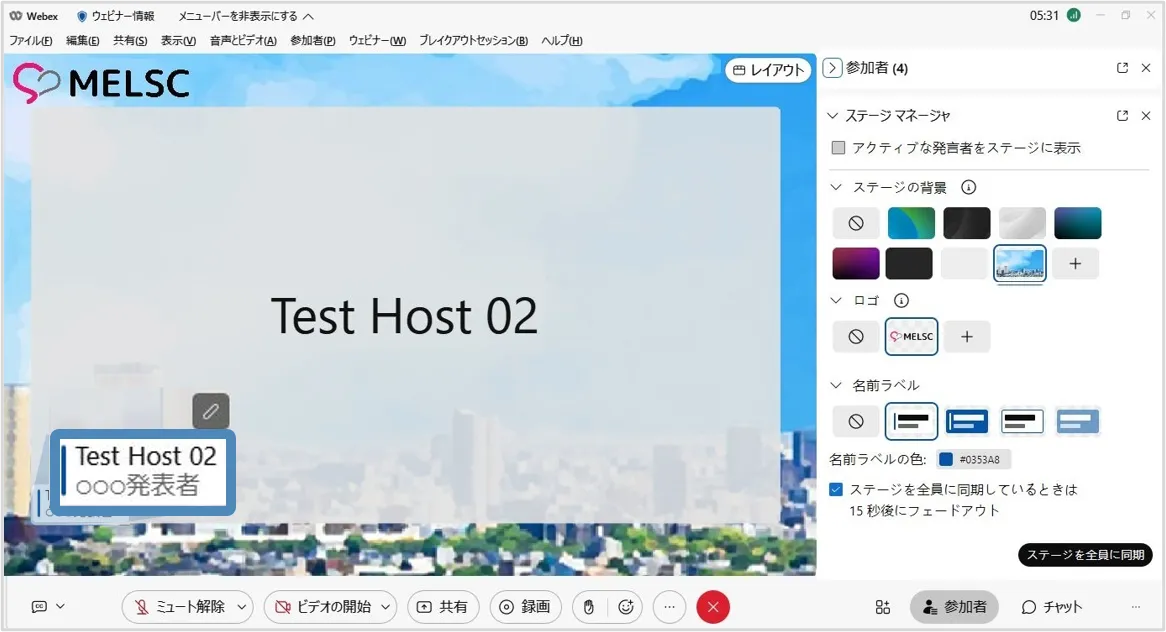 ※停止した場合,出席者はステージマネージャーで設定した背景などは利用することはできません.再度「同期」するとステージマネージャーで設定したレイアウトを使用できます.