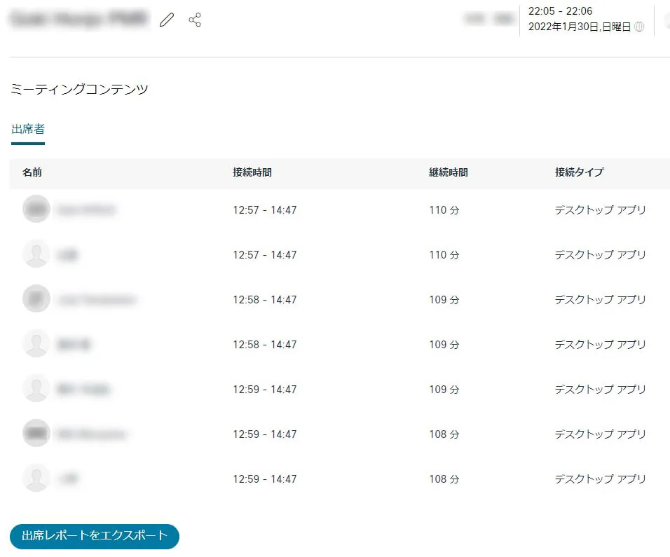 - 出席者が表示されます.必要に応じて「出席レポートをエクスポート」します.