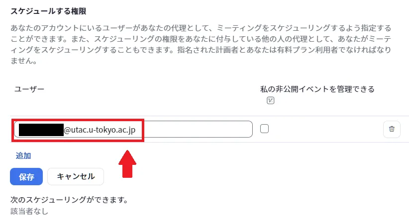 - 「代替ホスト」欄に,追加対象のユーザーのUTokyo Account(数字10桁の共通ID +