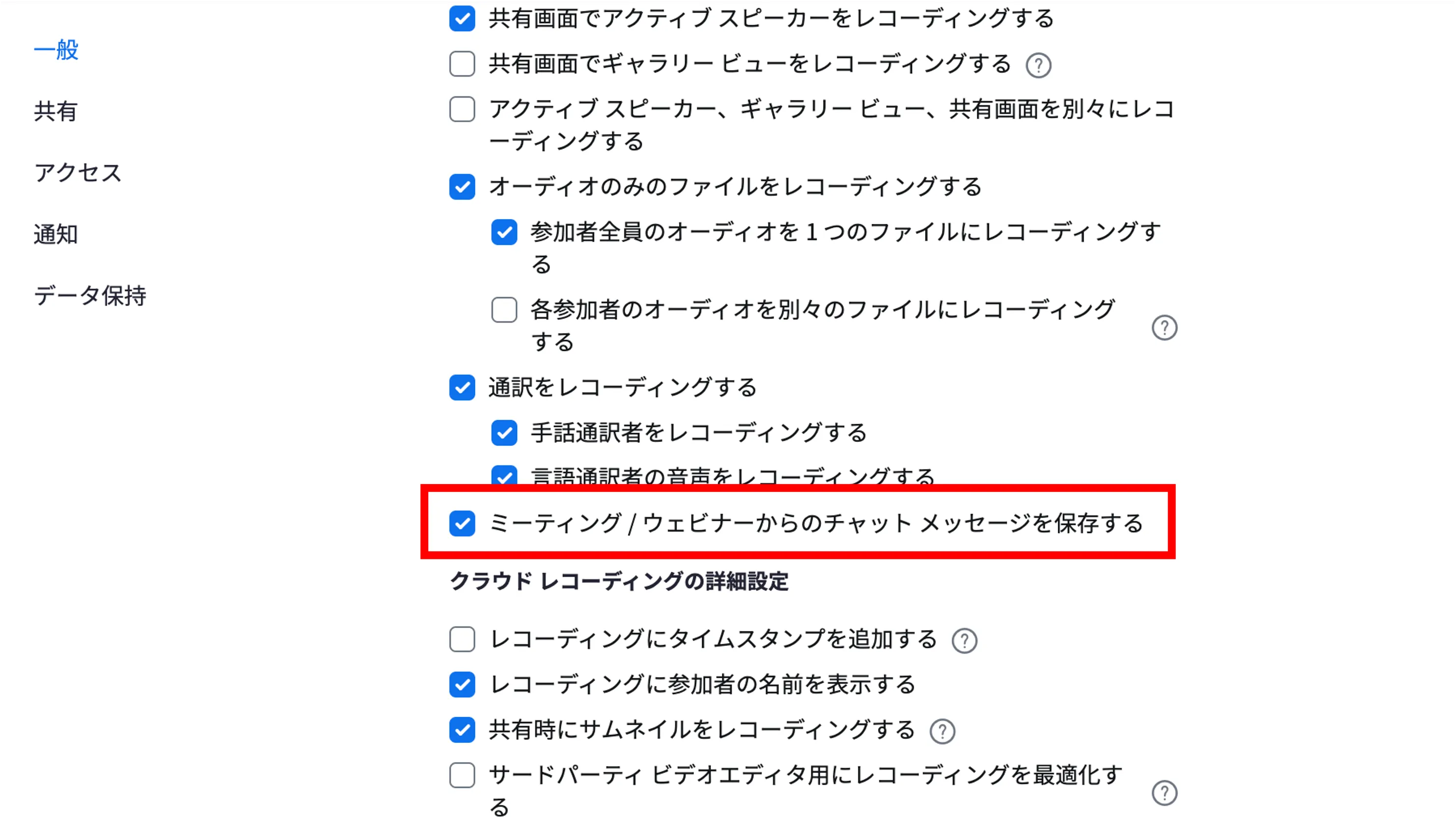 - 「一般」セクションの「クラウドレコーディング」のトグルをオンにし,「ミーティング / ウェビナーからのチャット メッセージを保存する」にチェックを入れください.その上でクラウドレコーディングをすると,チャットの内容も自動でクラウドに保存されます.
