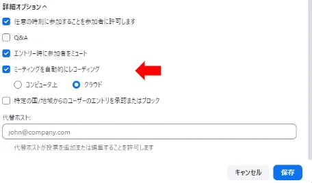 - ミーティングの作成または編集画面下部の,「オプション」または「詳細オプション」という項目を開き,「ミーティングを自動的にレコーディング」にチェックを入れてください.