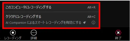 - 「このコンピュータにレコーディングする」と「クラウドにレコーディングする」という選択肢のうち,使いたい方を押すと,レコーディングが開始します.